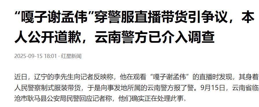 9月13日下午,嘎子特意发布了一条道歉视频,他说直播时所穿的警服是剧组拍摄专用的戏服。